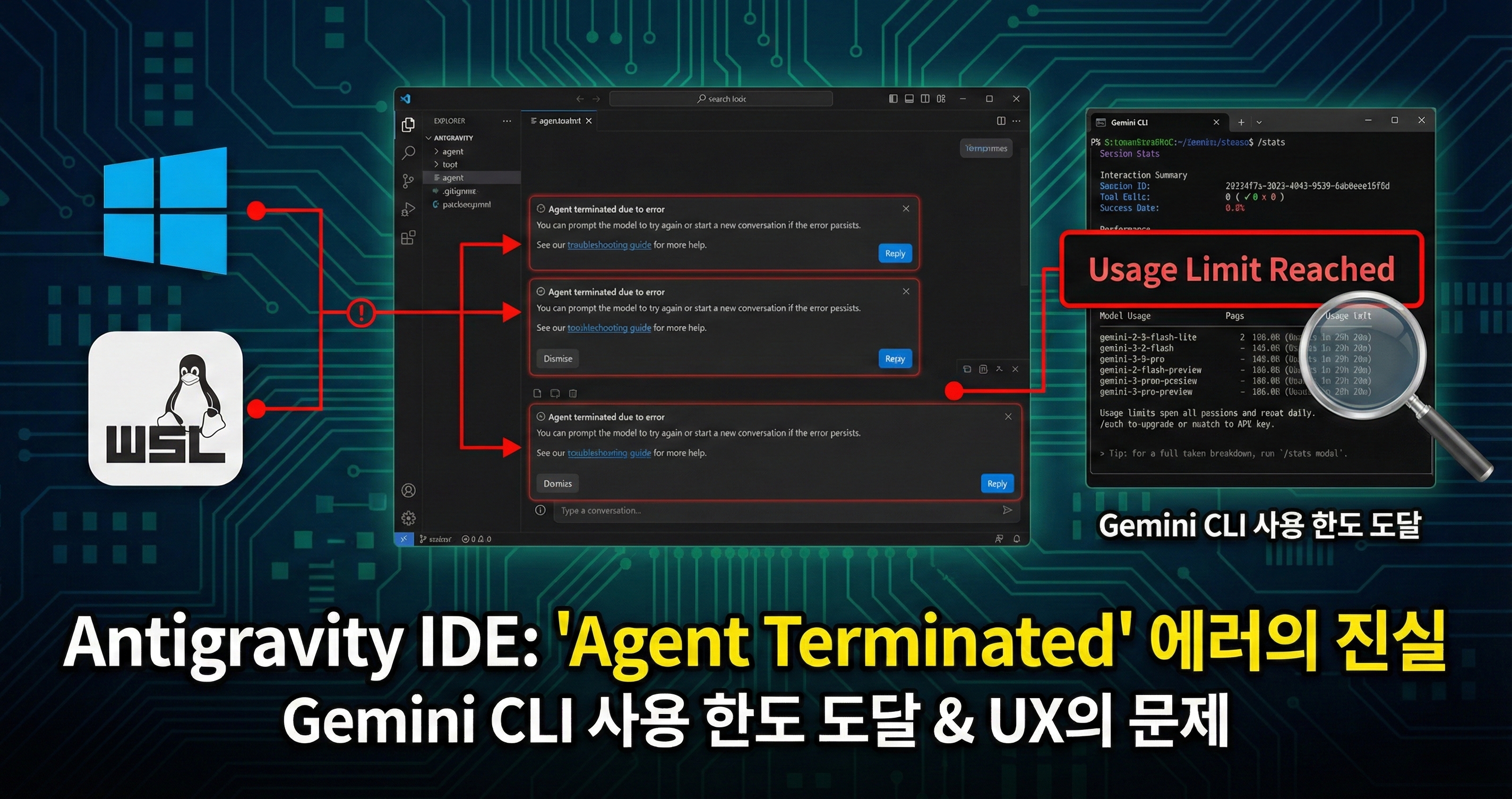 Antigravity IDE에서 반복적으로 발생하는 "Agent terminated due to error" 에러의 원인을 파악했습니다. Windows와 WSL 환경 모두에서 동일한 문제가 발생했으며, Gemini CLI의 /stats 명령어를 통해 사용 한도 도달이 근본 원인임을 확인했습니다. 다른 AI IDE들과 달리 Antigravity는 사용 한도 도달 시 명확한 안내 없이 일반적인 에러 메시지만 반복 표시하는 UX 문제가 있습니다.