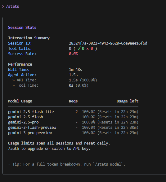 Antigravity 대신 Gemini CLI를 실행하고 /stats 명령어로 사용 현황을 확인: