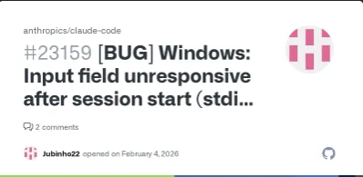 Windows 환경에서 Claude Code v2.1.31로 자동 업데이트된 후 입력 필드가 응답하지 않는 현상이 발생했습니다. 키보드 입력, 붙여넣기가 전혀 작동하지 않아 터미널을 강제 종료해야 하는 상황이었습니다. 이 글에서는 해당 버그의 원인과 임시 해결책을 공유합니다.